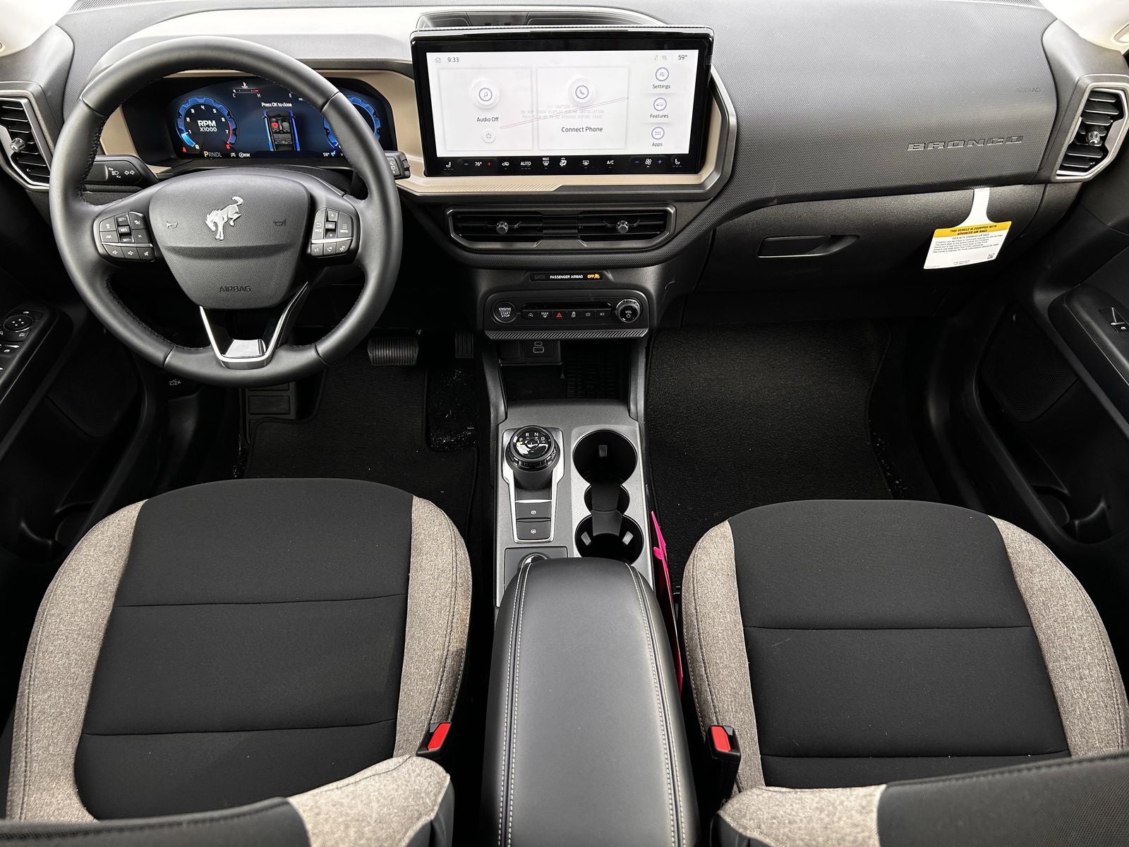 This 2025 Ford Bronco Sport Big Bend in Azure Gray Metallic comes with the following features: 1.5L EcoBoost 8-Speed Automatic 4WD Convenience Package (Front Driver/Passenger Seat Back Map Pockets, Heated 8-Way Power Driver's Seat, LED Fog Lamps, Premium Wrapped Steering Wheel, and Universal Garage Door Opener (UGDO)), Equipment Group 200A, 4-Wheel Disc Brakes, 6 Speakers, ABS brakes, Air Conditioning, Alloy wheels, AM/FM radio: SiriusXM, AM/FM Stereo, Auto High-beam Headlights, Automatic temperature control, Brake assist, Cloth w/Easy-to-Clean Front Bucket Seats, Compass, Delay-off headlights, Driver door bin, Driver vanity mirror, Dual front impact airbags, Dual front side impact airbags, Electronic Stability Control, Emergency communication system: SYNC 4 911 Assist, Four wheel independent suspension, Front anti-roll bar, Front Bucket Seats, Front Center Armrest, Front License Plate Bracket, Front reading lights, Fully automatic headlights, Heated door mirrors, Illuminated entry, Knee airbag, Low tire pressure warning, Occupant sensing airbag, Outside temperature display, Overhead airbag, Overhead console, Panic alarm, Passenger door bin, Passenger vanity mirror, Power door mirrors, Power steering, Power windows, Radio data system, Rear anti-roll bar, Rear Parking Sensors, Rear reading lights, Rear seat center armrest, Rear window defroster, Rear window wiper, Remote keyless entry, Security system, SiriusXM, Speed control, Speed-sensing steering, Speed-Sensitive Wipers, Split folding rear seat, Steering wheel mounted audio controls, SYNC 4 w/Enhanced Voice Recognition, Tachometer, Telescoping steering wheel, Tilt steering wheel, Traction control, Trip computer, Variably intermittent wipers, and Wheels: 17 Carbonized Gray-Painted Aluminum.