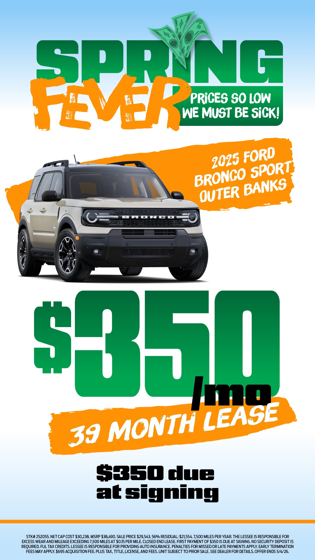 2025 Ford Bronco Sport Outer Banks https://www.southwestford.com/new-Weatherford-2025-Ford-Bronco+Sport-Outer+Banks-3FMCR9CN4SRF23745 $350/mo 39 month lease $350 due at signing STK# 252055. NET CAP COST $XXXX. MSRP $38,490. SALE PRICE $29,543. 56% RESIDUAL: $21,554. 7,500 MILES PER YEAR. THE LESSEE IS RESPONSIBLE FOR EXCESS WEAR AND MILEAGE EXCEEDING 7,500 MILES AT $0.15 PER MILE. CLOSED END LEASE. FIRST PAYMENT OF $350 IS DUE AT SIGNING. NO SECURITY DEPOSIT IS REQUIRED. FUL TAX CREDITS. LESSEE IS RESPONSIBLE FOR PROVIDING AUTO INSURANCE. PENALTIES FOR MISSED OR LATE PAYMENTS APPLY. EARLY TERMINATION FEES MAY APPLY. $695 ACQUISITION FEE. PLUS TAX, TITLE, LICENSE, AND FEES. UNIT SUBJECT TO PRIOR SALE. SEE DEALER FOR DETAILS. OFFER ENDS 5/4/26.
