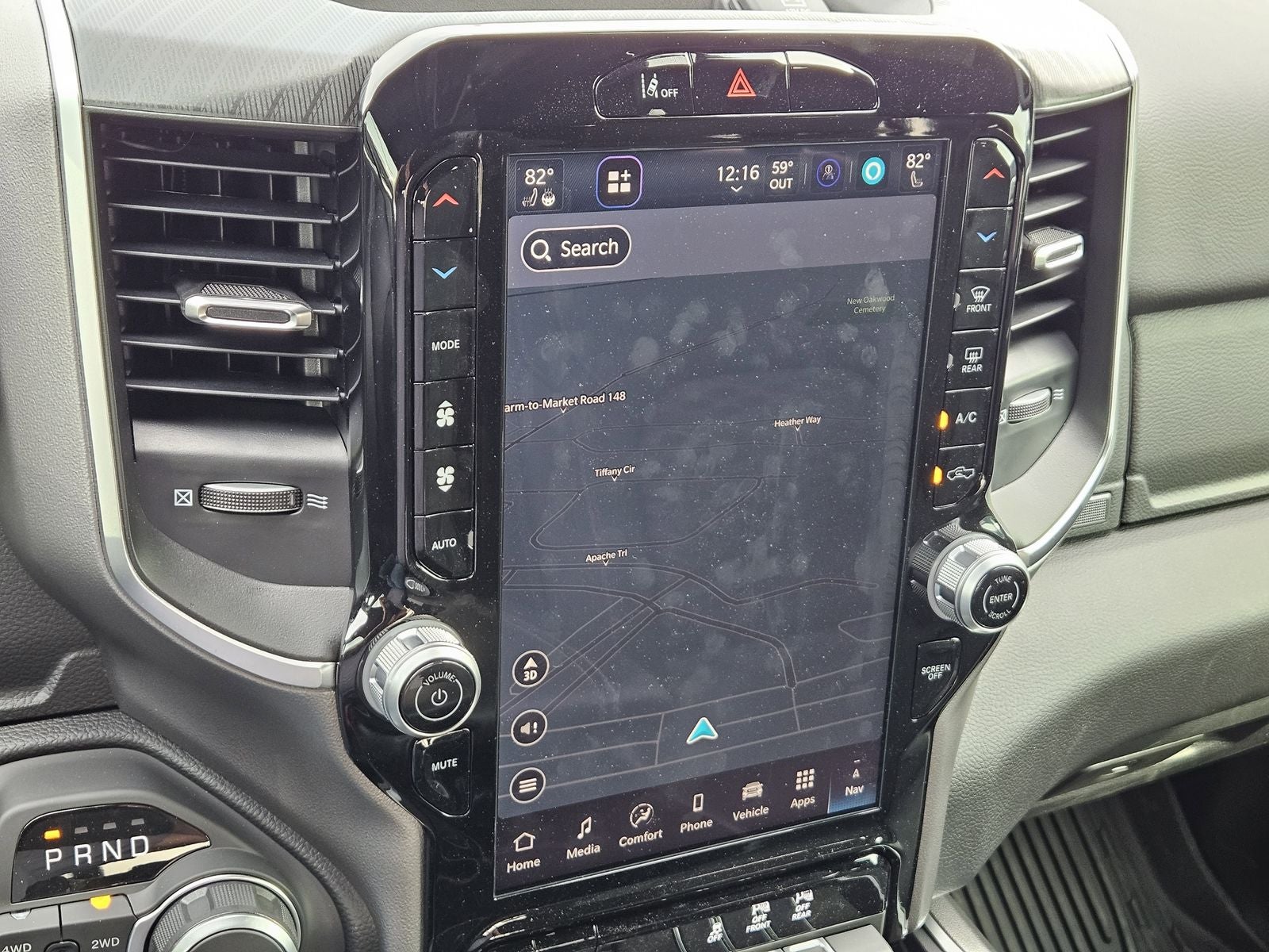 Inside the spacious crew cab, you’ll find premium features like heated front seats, an 8-way power driver seat with lumbar support, leather-wrapped heated steering wheel, and dual-zone automatic climate control. Technology is front and center with a 12-inch Uconnect® touchscreen, Apple CarPlay®, Android Auto™, WiFi hotspot capability, navigation-ready system, and remote start.